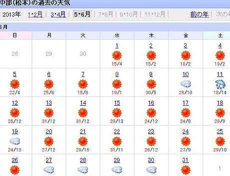 5月のYahoo!天気の「過去の天気」を見たら、見事に晴