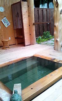 戸倉上山田温泉の旅館、亀清の「青い目の若旦那」タイラーさんが、大工さんと手作りで作った貸切露天風呂。
