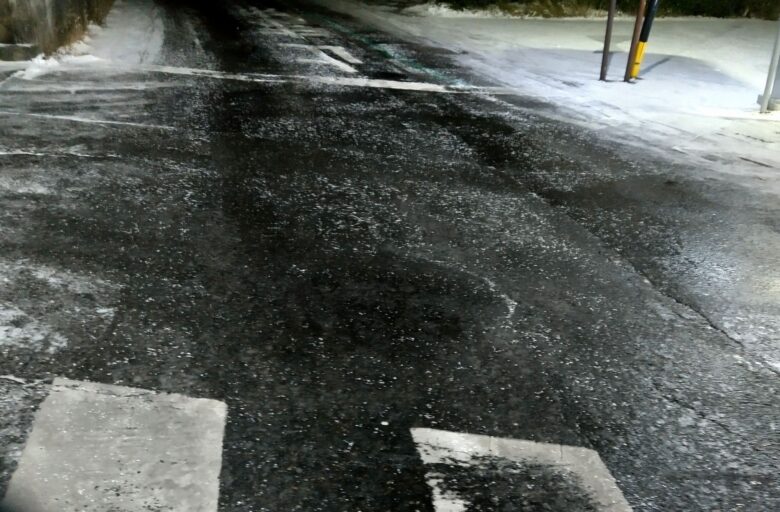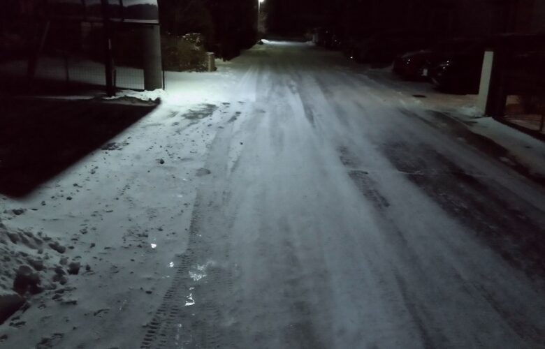 「横なぐりの雪」の後、夜11時に、すべすべ・ガチガチの道を自転車で何とか帰宅。道には人も車もまったくありません。
