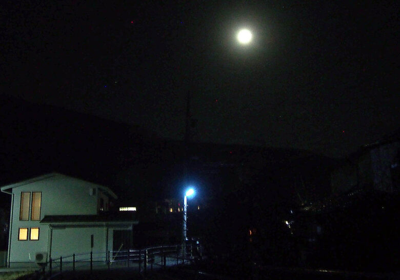 満月の頃は、夜9時位に山ぎわから丸い月が昇り、街灯が少なくて暗い田舎の街を照らします。