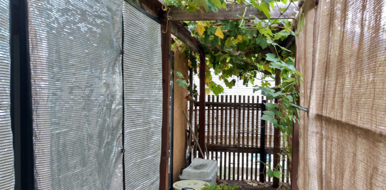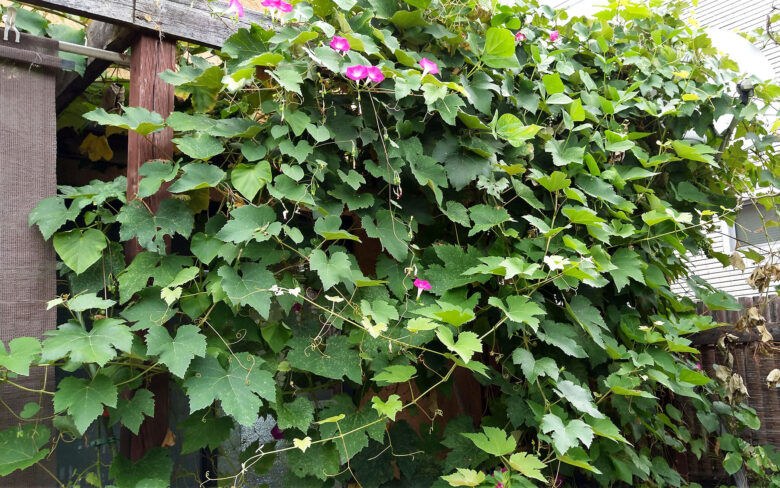 葡萄棚と朝顔・ミニトマト・インゲン豆でジャングルのようになっている「緑のカーテン」と、
