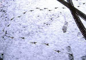 駐車場に昨夜降った雪の上に、鳥の足跡がくっきりと付いてました。