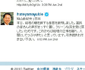 ・鳩山首相の辞任を知ったのは、ふと見たTwitterで、本人の「"本日、総理の職を辞する意思を表明しました。・・"」というつぶやきを直に(?)読んだからだった。