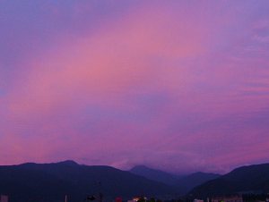 夕方、オフィスの窓からふと外を見ると、美ヶ原上空が一面茜色に夕焼けしてました。