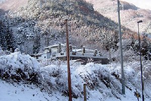 雪の中山道。木曽川の水と、雪をかぶった木々とが、あまりにも美しい水墨画の世界を見せてくれました。