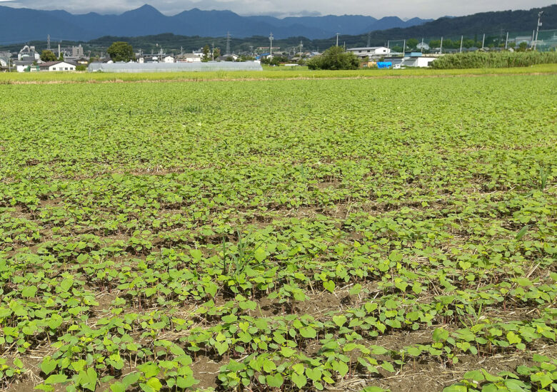 近くの麦畑が麦の収穫の後、蕎麦の二毛作をやるようで、蕎麦の新芽が一面に出てます。