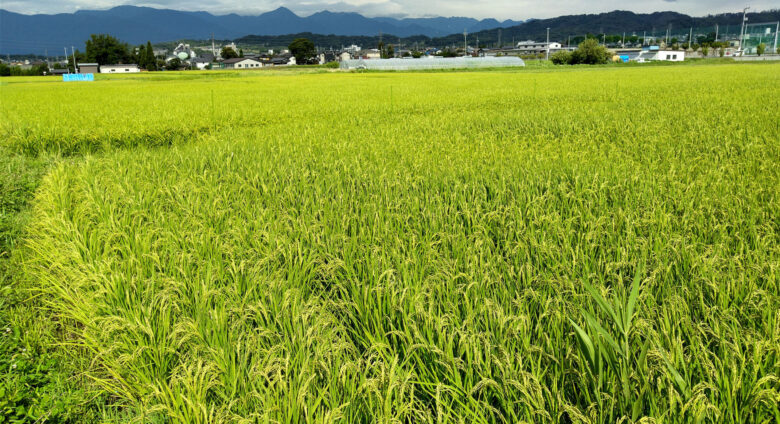 その奥の田んぼは、穂が出だした黄緑色の稲が奥のアルプスの山景色の前に写真映えします。… 続きを読む