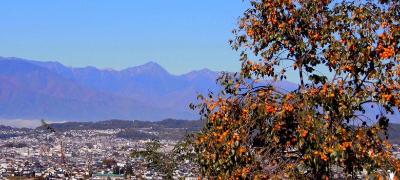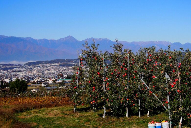 その帰り道からは、リンゴ畑や柿畑と北アルプスが、秋の信州らしい絶景を見せてくれます。