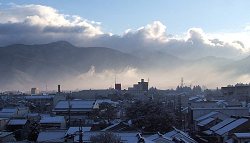 雪がやんだ朝。山際に一面に朝霧が見え、美ヶ原方面の山や蔵の屋根の雪景色とともにすばらしい光景だった。