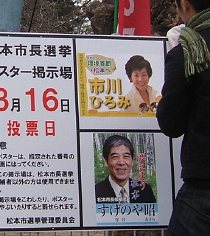 元収入役の市川ひろみ(博美)さんと、現市長のすげのや(菅谷)昭さんの「元部下対上司」の一騎打ち。前回の選挙時の市民芸術館建設問題のようなわかりやすい争点がないことで、今のところ投票率が低くなりそうで心配されている… 続きを読む