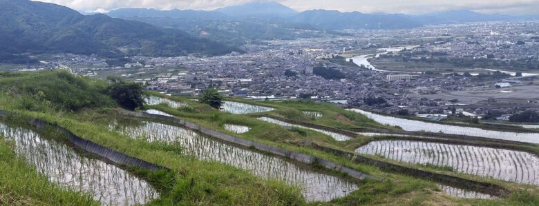 姨捨駅で電車を下り、行きは、最近始まった上田&千曲のシェアサイクルサービスを利用して、田植え直後の美しい姨捨の棚田と悠々と流れる千曲川の景色を見ながらサイクリングを満喫しました。
