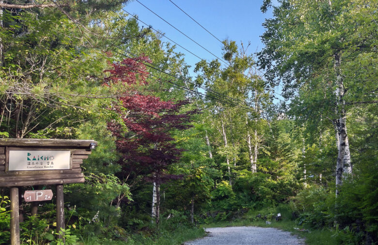 標高と周辺の森のために、猛暑の市街地より5℃~10℃ぐらい涼しく、車はエアコンなしで窓を開けて走行。