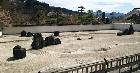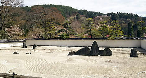 京都の龍安寺より広々としているのは、広さだけでなく、木曽の自然が借景になっているから。