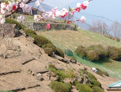 えーっ、ここに!?というような急斜面、立っているのも大変な場所に、家と畑があり、ちゃんと農作業をされている方も見える。