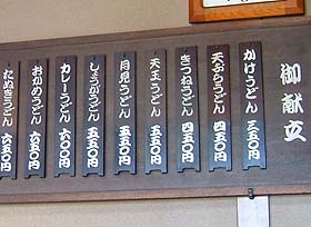 「天玉うどん」(天ぷらと卵?)と「月見うどん」(卵)が同じ値段だったり、「しょうがうどん」とか「おかめうどん」というメニューがあるのもユニーク。