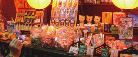 店内は、レトロなポスター、昔懐かしいおもちゃ、駄菓子屋のキャンディや景品のコレクションでいっぱい。