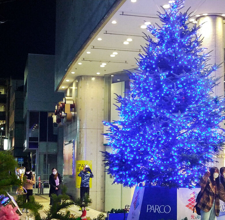 パルコ前では、恒例のクリスマスツリーが美しく輝いていました。