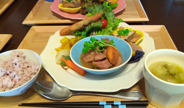 食事のメニューは、出身の宮崎の伝統料理という鶏南蛮や、ドイツ風豚カツやトルコ風鶏料理など。ご飯は古代米で、こだわり満載。
