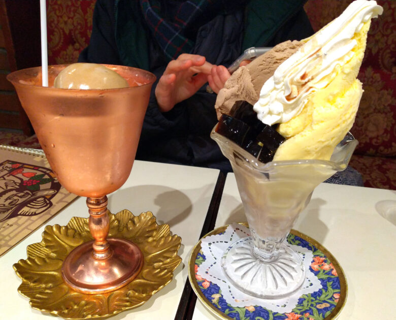 50年前に、日本の「喫茶店」で初めて開発したという「モカパフェ」と「モカクリームオーレ」。