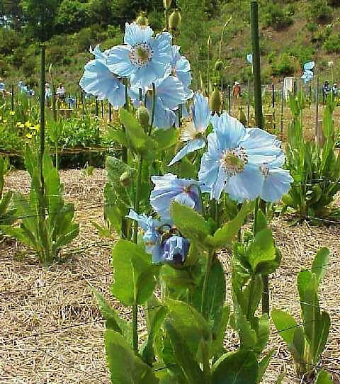 標高3000-5000メートルの高地に自生する花で、苗も売っていますが、耐暑性が非常に弱いので栽培は簡単ではありません。また、低地では、咲いても色があまり青くならないようです。高地で短期間しか咲かないために「幻の花」とも呼ばれます。大池高原は標高が1500mあるとはいえ、これだけたくさんの株に増やされたのは並大抵のご苦労ではなかったでしょう。
