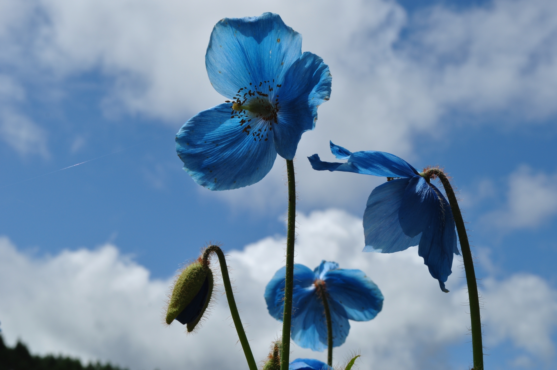 正式名は「メコノプシス」で、ブルーポピーとも呼ばれます。「ヒマラヤンブルー」と言われる神秘的な色は、一度見ると目に焼きつきます。本場のヒマラヤや中国雲南省では、コバルトブルー・紫・黄・赤など色々な色があります。