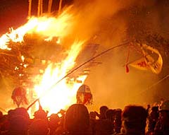13日に、御柱祭のように、山から高さ20メートルもあるブナの木を運び、前日の14日のお昼頃に組み立てられて15日までに社殿が作られます。15日の19時頃、火打ち石で採火した火を、たいまつにつけて運び、20時に花火が打ち上がり、火祭りが始まります。社殿に火をつけようとする側と、守ろうとする側との白熱した攻防戦です。社殿に火が入って燃え上がる22時半過ぎ、祭りは最高潮に達します。社殿は一晩で全部燃やされます。