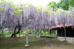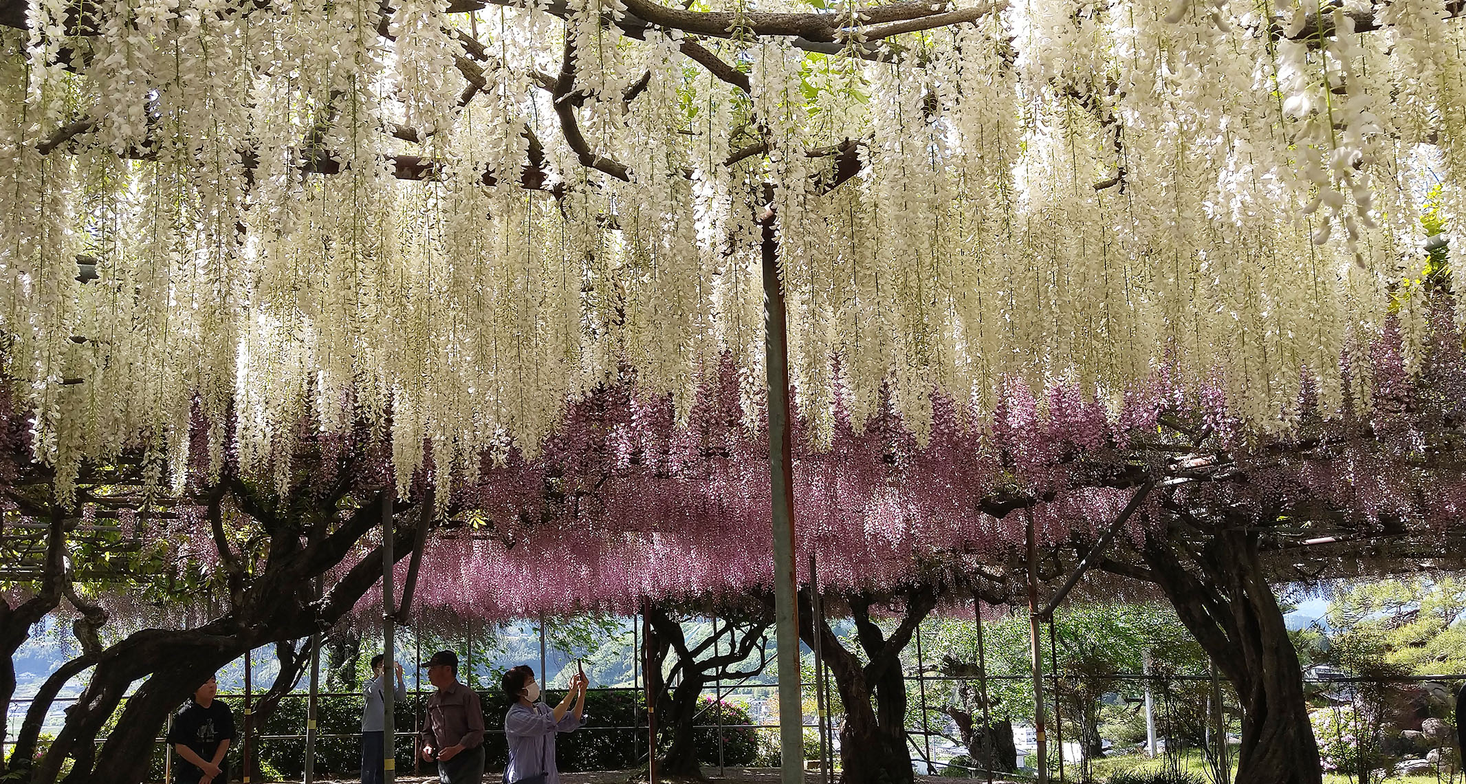 飯田市の北東に位置する曹洞宗のお寺「泉龍院」には、3色の花が咲く珍しい藤棚があります。紫とピンク(薄桃色)の2種類の「藤色」の他、真っ白なフジがあり、紫→ピンク→白の順番に咲き出しますが、GWの頃にちょうど3色が見られます。