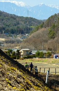 四賀地区は、里山と、雪が残る北アルプスも望める場所です。