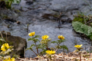 福寿草は、一面枯れ野と雪で覆われた信州の長く厳しい冬の終わりに真っ先に咲き、春の訪れを告げてくれる花です。寒さが厳しい日や時間帯は、花が自分を守るために閉じます。