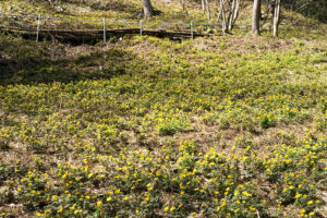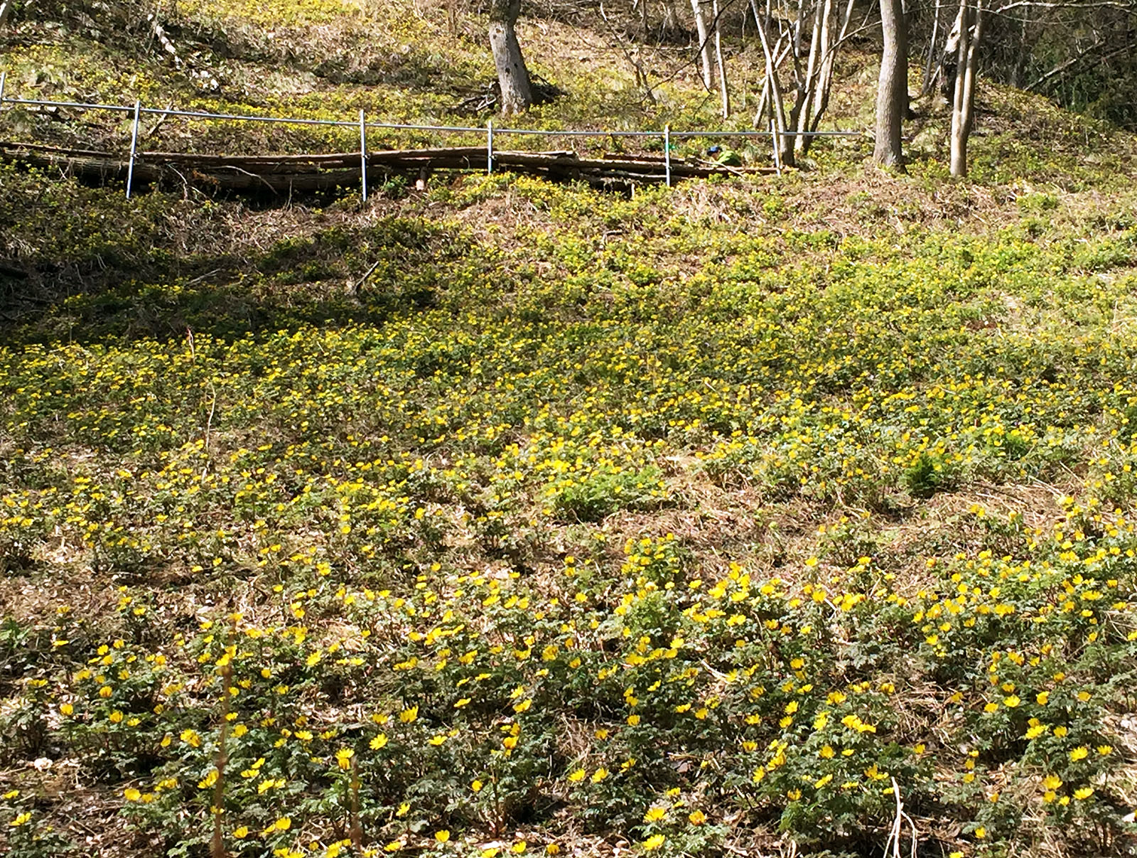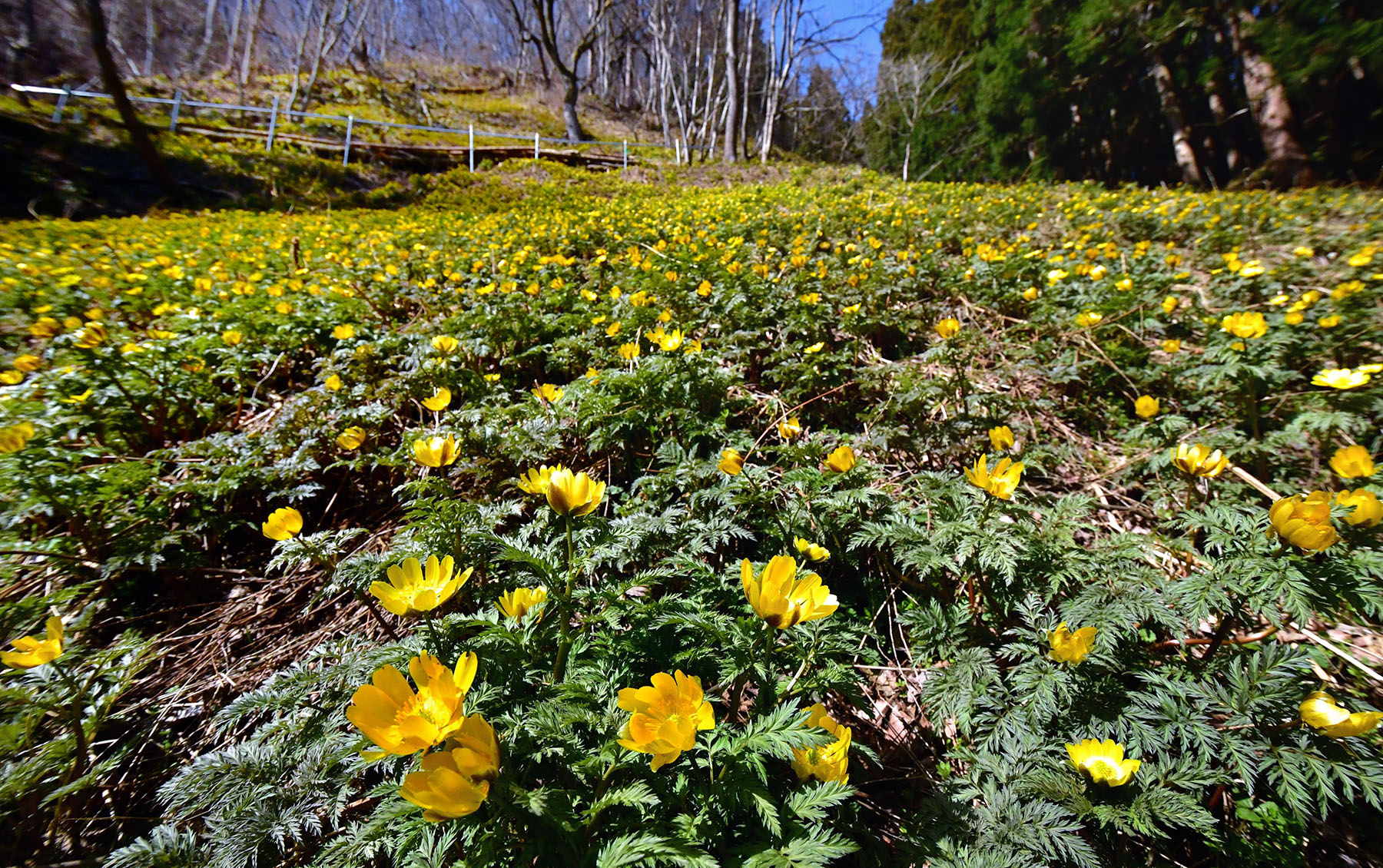 東に面した急傾斜地に3万本以上の福寿草が群生していて、東北信随一と言われる密集した福寿草は見応えがあります。