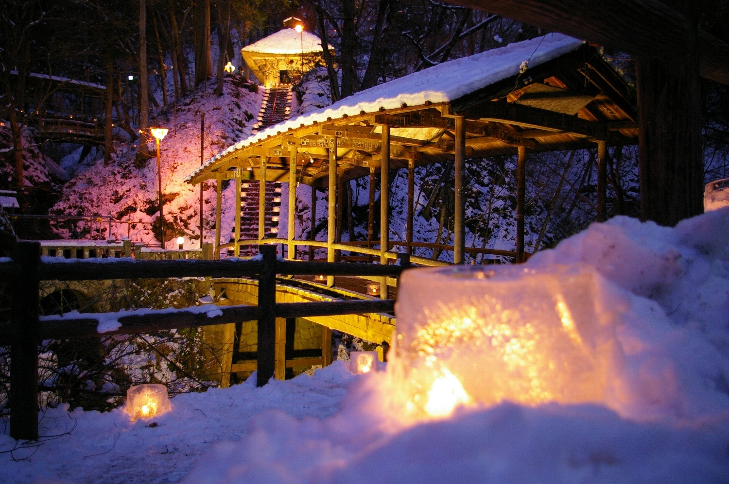 「氷灯ろう夢祈願」は、昔からの温泉らしい温泉地、また、保養地として地元でも人気の高い鹿教湯温泉の厳冬期を彩るイベントです。氷の中にろうそくの炎が揺れる約200個の「氷灯篭」が、温泉街の散歩コースに沿って、「湯端通り」から、珍しい屋根付きの橋として映画「マディソン郡の橋」がヒットした時話題になった五台橋、石段を上って薬師堂まで続きます。