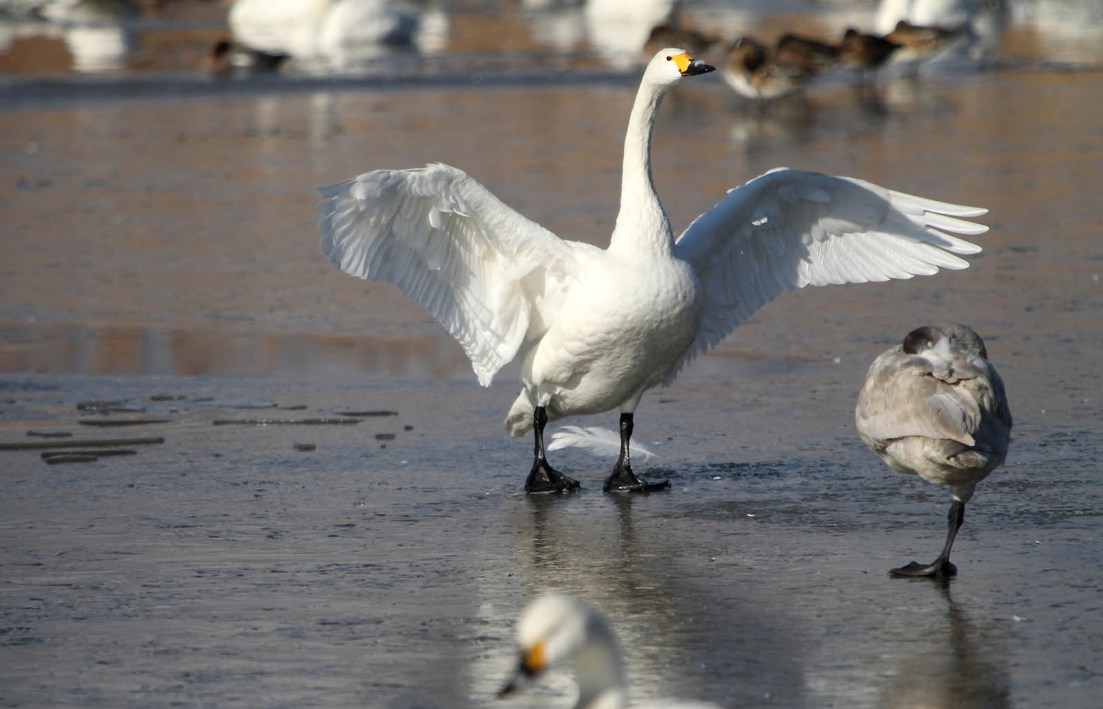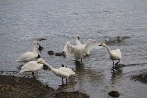 北に帰る時期になると、幼鳥と共に飛ぶ練習をする白鳥たちが見られます。近年は、地球環境の変化とシベリアでのえさ不足のせいか、北帰行が大幅に遅れて5~6月までかかることもあり、見守る人をやきもきさせます。