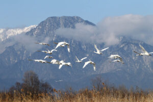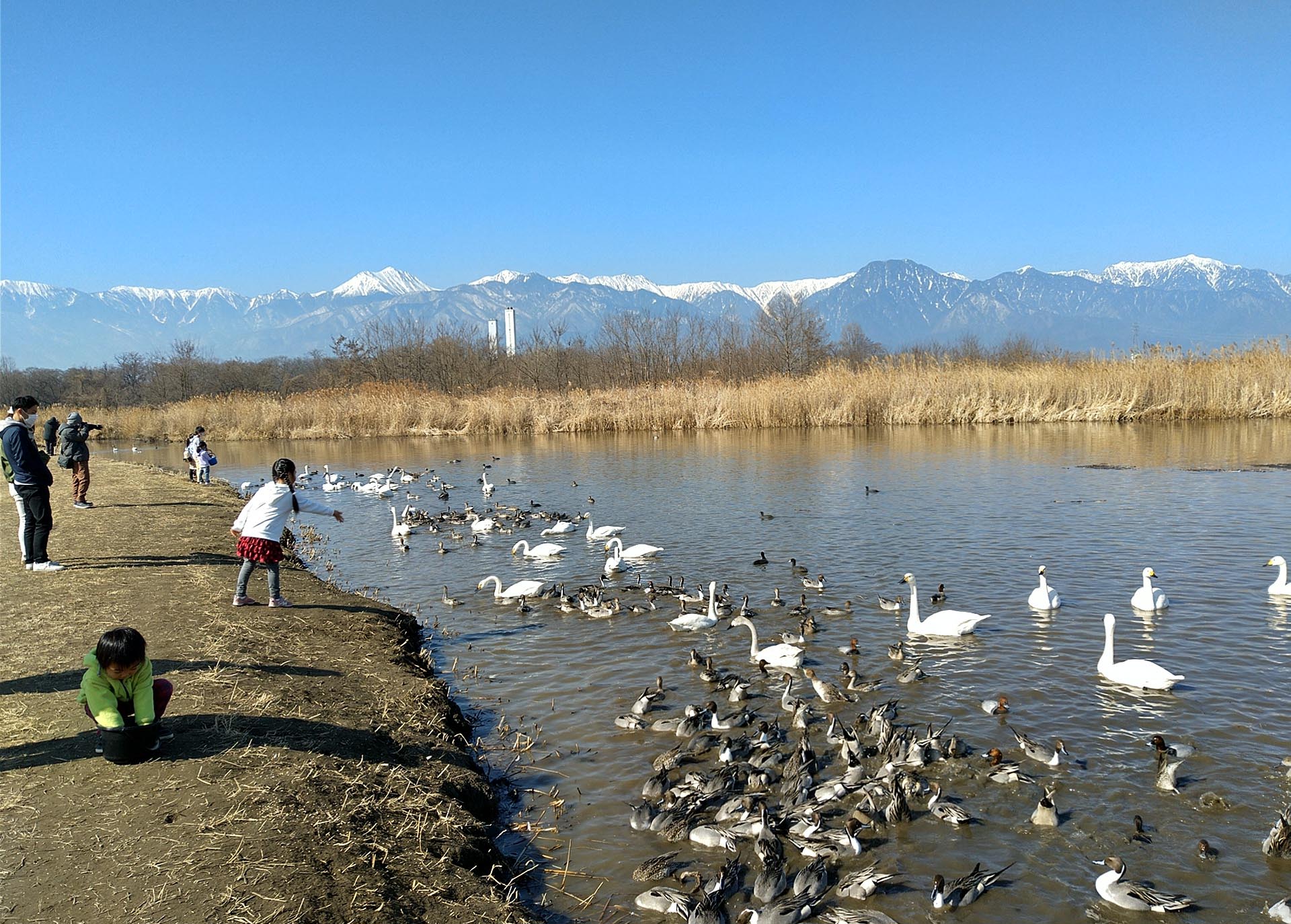 安曇野の犀川のほとりにある白鳥湖(ダム湖)と遊水池の2ヶ所に、10月中旬頃からコハクチョウが飛来し始め、越冬し、3月末頃までに北方に帰ります。1月が最もたくさんの白鳥を見られる時期です。