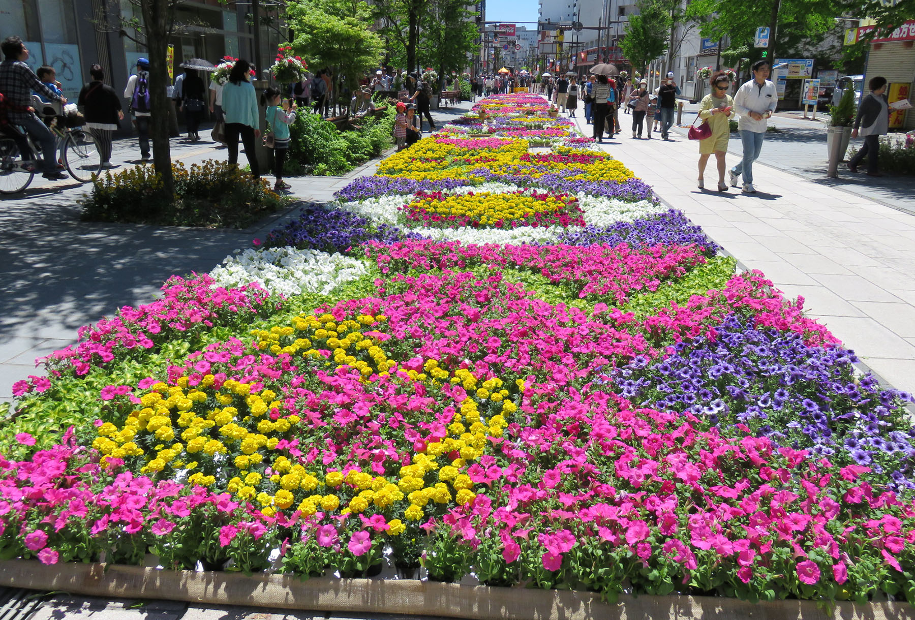 タペストリーガーデン(実行委員会提供)ゴールデンウイークの期間に、長野駅から善光寺までの街角を花で彩る「ながの花フェスタ 善光寺花回廊」が開かれます。「善光寺花回廊」は、2002年に行われて好評を博した、道に花びらを敷き詰める「インフィオラータ」から始まったイベントです。2005年からは、インフィオラータはミニ版の「花キャンバス」として行われるようになり、他にも、「花で街路を彩る」というコンセプトに基づいて、 いろいろな楽しい企画が見られます。花が幾何学模様を描く「タペストリーガーデン」、「回廊花壇」、オープンカフェ、一般公募の「フラワーガーデンコンテスト」の入賞作品の展示などが楽しめます。
