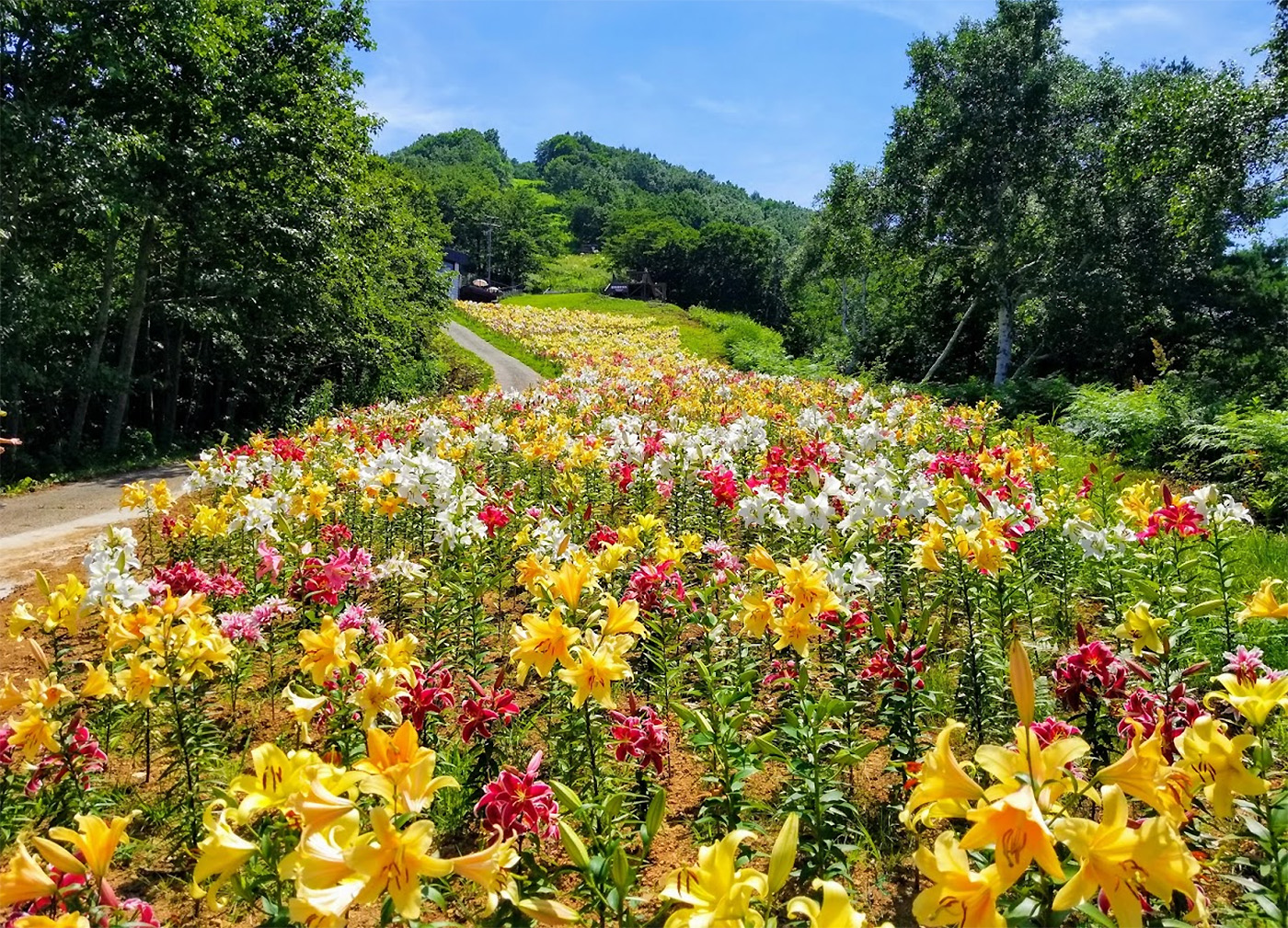毎年色とりどりのユリのお花畑が出迎えてくれます。