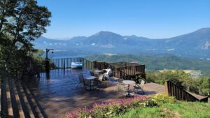朝は、ユリ畑を見ながらリフトで🚠斑尾山の中腹の野尻湖を見下ろすテラスへ(1ページ目)遠くに見える山々⛰️は北信五岳のうち右から妙高山、黒姫山、飯綱山(どれにも登りませんが😆)