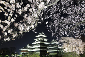 300本の桜の咲く国宝松本城で、ライトアップされた天守閣を眺めながら、お茶会や琴やフルート・雅楽の演奏を楽しむことができます。豚汁なども振る舞われます。