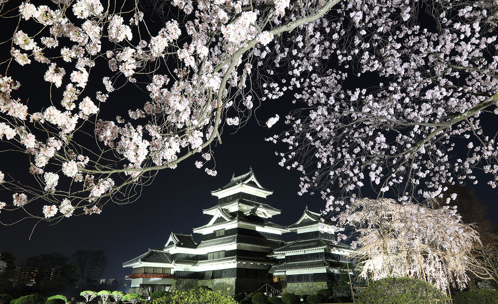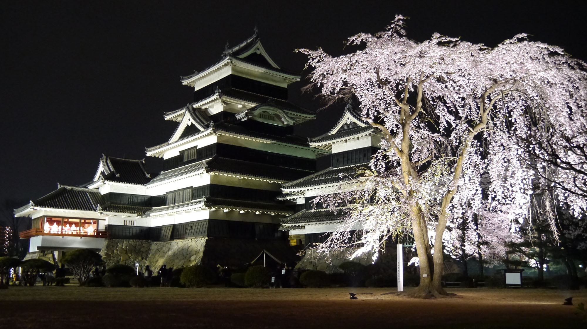 夜桜会時の松本城と「駒つなぎの桜」