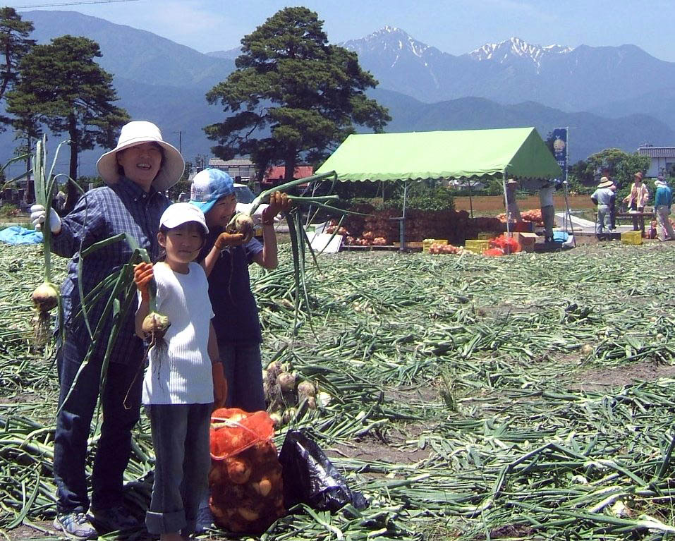 安曇野の豊科地区・堀金地区は美味しいタマネギの産地で、新玉ねぎの収穫の時期の6月、甘くて新鮮な新玉ねぎを収穫(タマネギ狩り?)して持ち帰れる「玉ねぎ祭り」が開かれます。20kg入りのネットをもらい、スーパーの詰め放題で鍛えた腕?を使い、畑の玉ねぎを抜いて詰められるだけ(上手い人は30kg近く)詰めて持って帰ります。普通にスーパーで買うよりもかなり安いです。収穫体験はせず、同じネットの玉ねぎを購入だけすることもできますが、自分で詰める方がおトクです。
