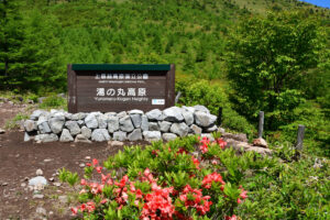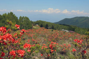 群馬県との県境に近い、破風高原自然園の五味池(5つの池の総称)と乳山牧場周辺に、レンゲツツジの大群落があります。信州のあちこちの高山で見られるレンゲツツジですが、その中でも破風高原のレンゲツツジは100万株をこえると言われ、長野県下最大規模です。6~7月の花の時期には、高原が朱色に染まり、圧巻です。
