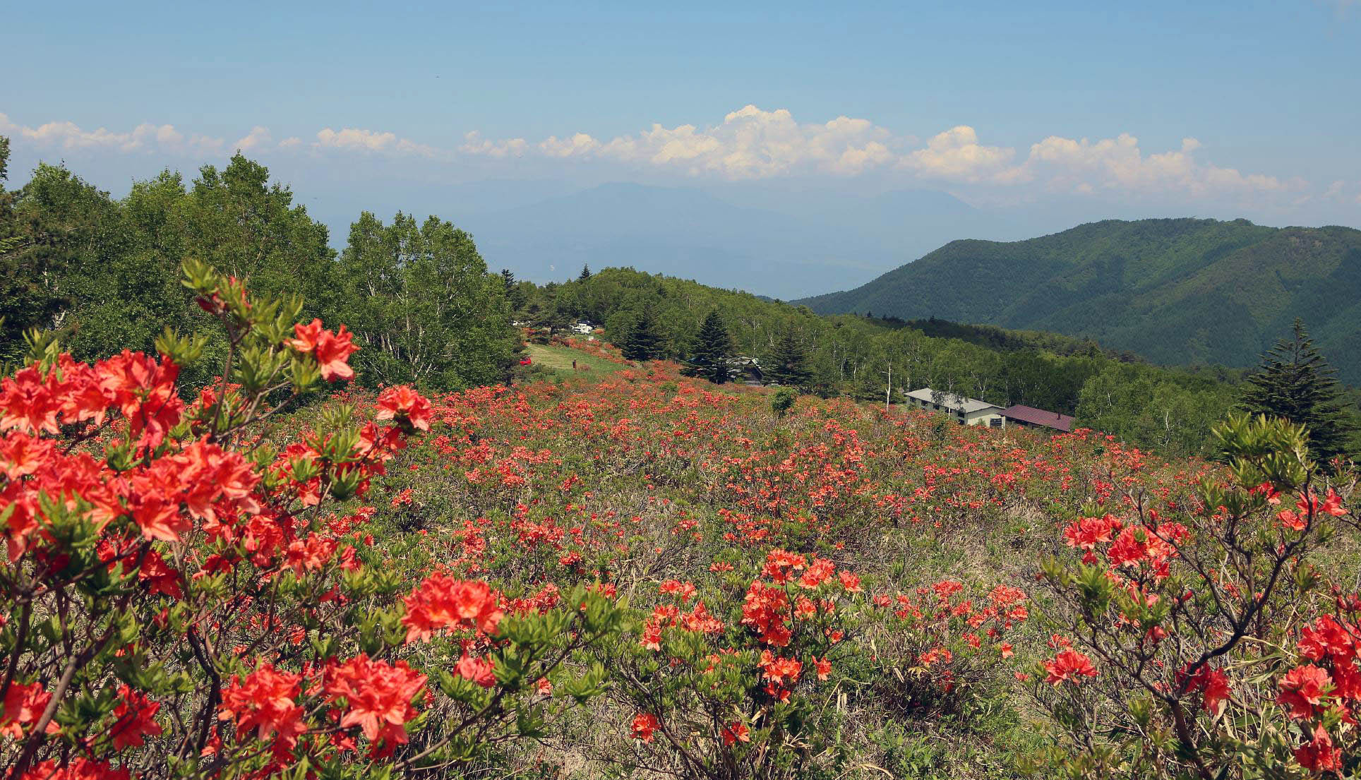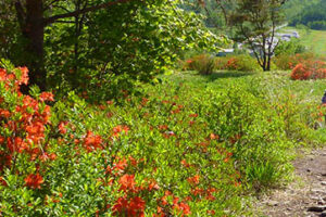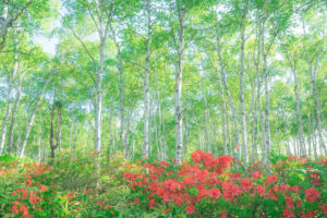 日当たりのよい高原に咲く山ツツジです。街路樹などで見慣れた園芸用のツツジとは異なり、花の色はオレンジ色に近い朱色一色で、他の花ではあまり見かけない独特の色です。白樺とのコントラストが特に美しく、目に焼きつきます。信州では初夏を彩る花として、高原はもとより、市街地で植えられているのも見かけます。