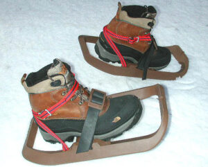 一方、最近人気のスノーシューは、北米の先住民などが使って来たもので、「西洋のかんじき」と呼ばれますが、かんじきとは形状・特質が異なり、よりフラットな所を歩くのに適しています。スノーシューは、着脱が楽で、表面積が広くて雪に潜りにくい反面、一旦潜ると上に雪が被さって足を上げるのに一苦労。また、傾斜のある斜面、とくに下りでは滑りやすいのが難点です。
