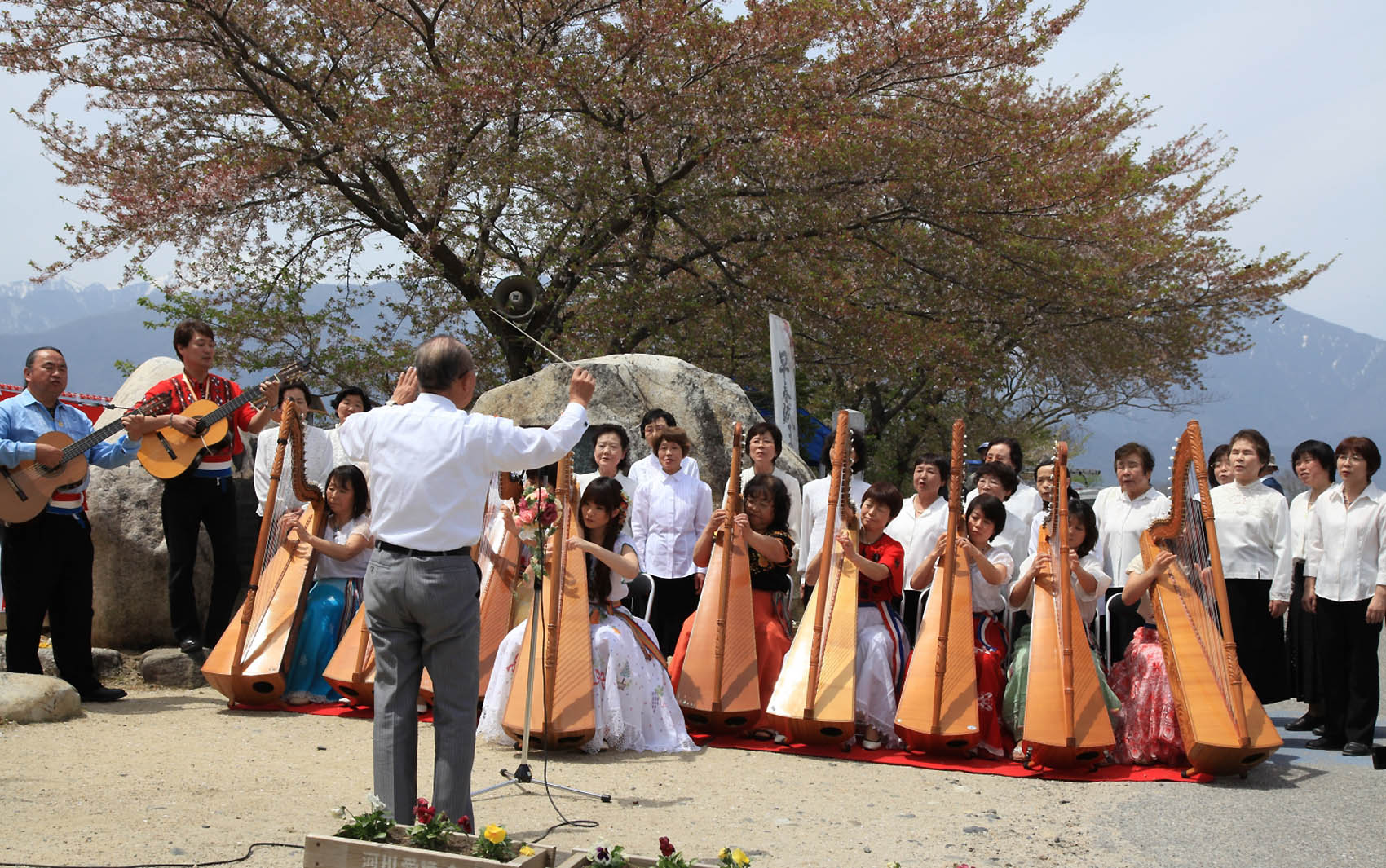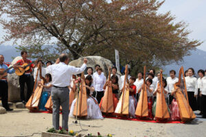 まさに早春の、肌寒いこともあるこの時期に、この歌碑の前で、残雪のアルプスの眺めをバックに、式典と、ハープやフルートの伴奏付きでコーラスが行われます。県外からもファンが聞きにかけつけます。地産品の販売や、地ビールが無料で提供されることもあります。