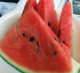 果物は昼夜の温度差が大きい方が甘く美味しくなります。また、アフリカ原産のスイカは、「日照り草」と呼ばれ、日照時間が長い方が良く育ちます。波田地域はこの条件にぴったり合い、また、火山灰土の土壌が栽培に適しています。メディアでも取り上げられて人気が全国区になりつつあります。特に下原地区のスイカは「下原スイカ」と呼ばれ、生産者達が「日本一甘くて美味しい」とPRしています。日本一かどうかはとにかく、とても甘くて美味しいです。