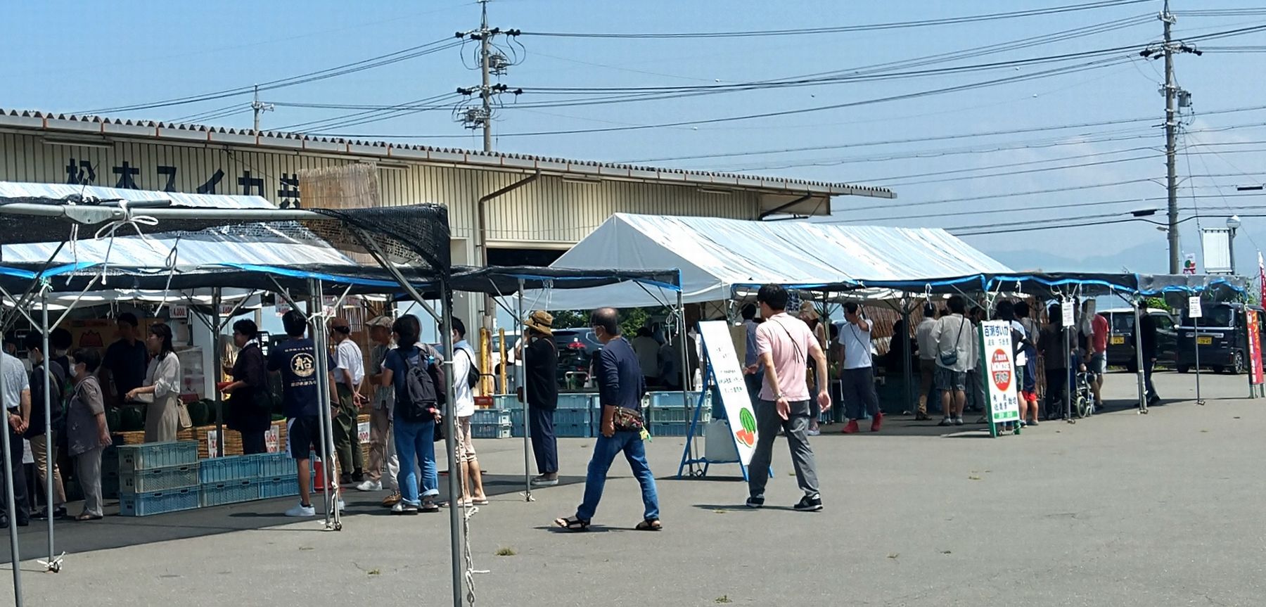 日本有数の美味しいスイカの産地、松本市波田下原に近いJA松本の旧スイカ共撰所(農家のスイカを集めて選別する施設)が、スイカの旬の時期に「すいか村」となります。テントでスイカ農家の方々が自慢のスイカを直接販売し、贈答用のスイカ~キズがあるが味は美味しい廉価品まで直売価格で購入できます。とうもろこし、トマト、モモなどスイカ以外の旬の新鮮な地場産農産物も特価で販売されます。