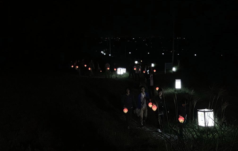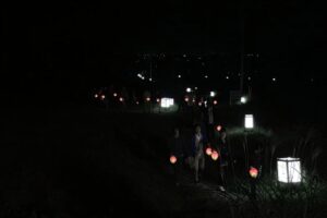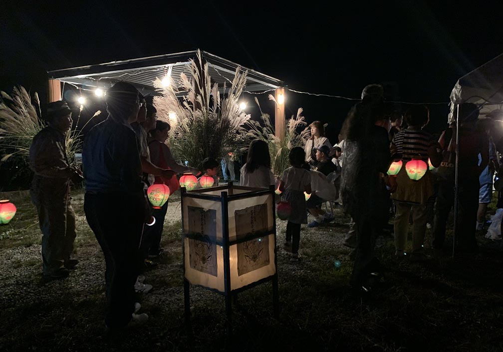 「すずむしヒーリング・ナイトツアー」は、提灯と行灯ちょうちんとあんどんのあかりだけで鈴虫の音色を楽しみながら、夜の田んぼ道を歩くナイトツアーです。コースの途中で、松川村の特産品の黒豆のお茶などのふるまいもあります。