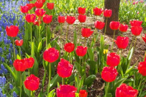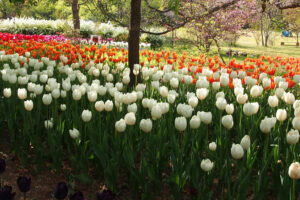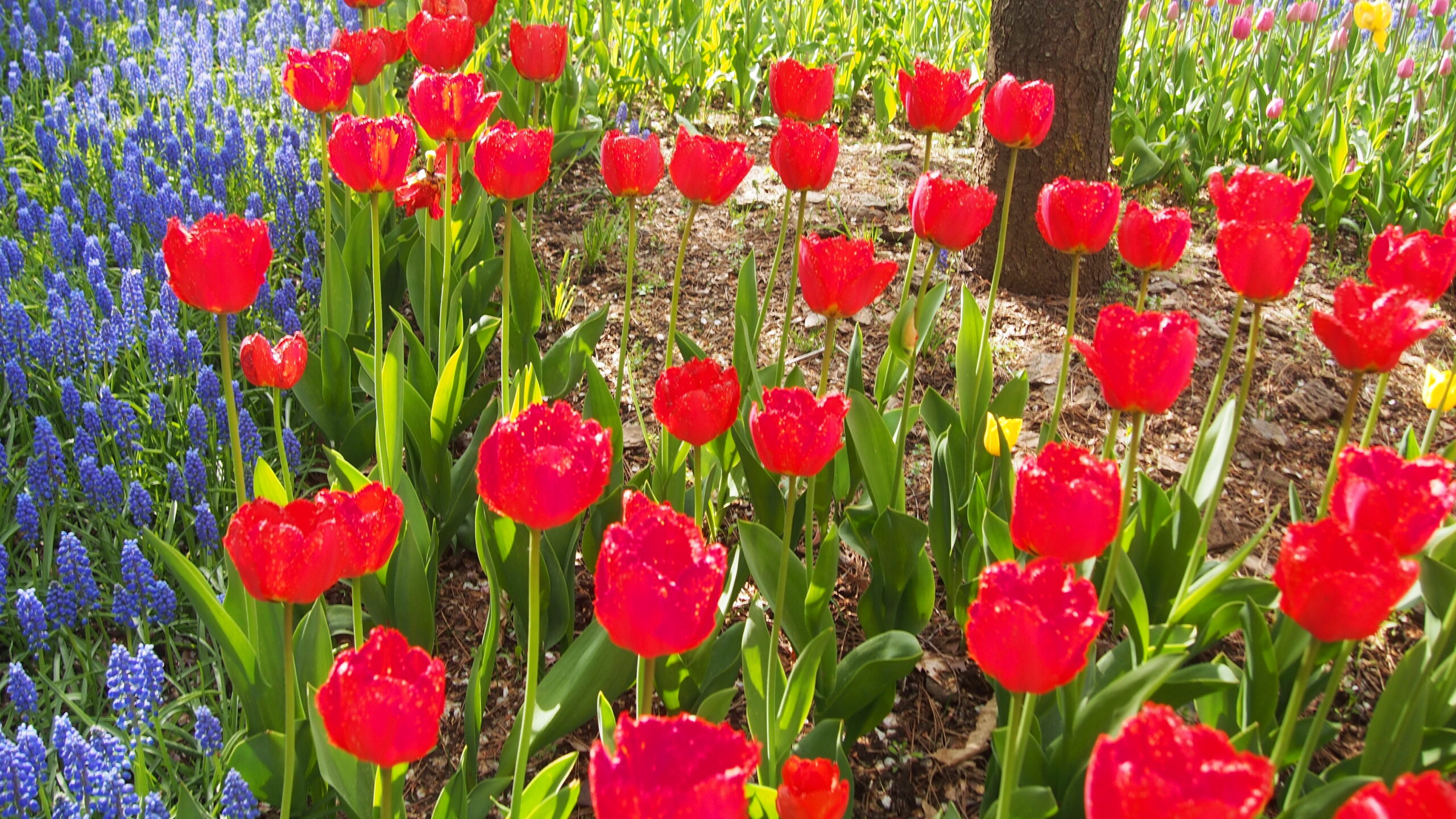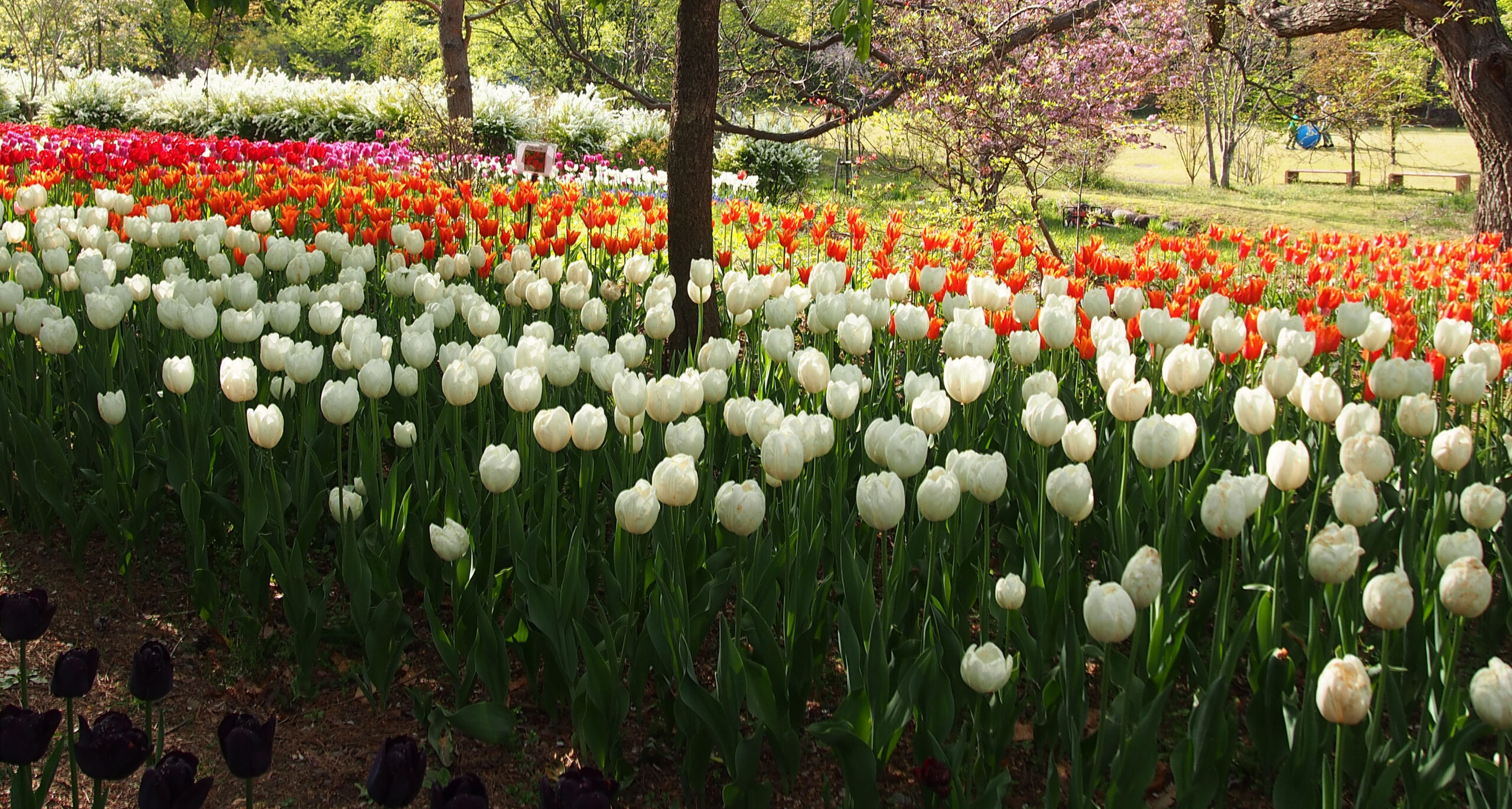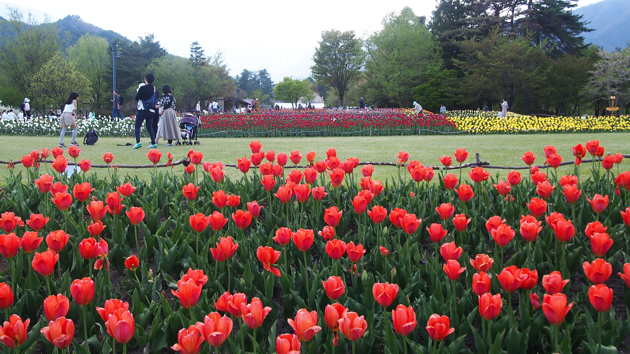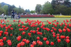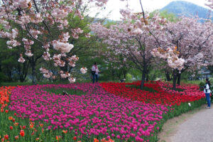 国営アルプスあづみの公園は春になるとさまざまな花が楽しめますが、中でも堀金・穂高地区のチューリップは年々増えて数百種類・数十万本の規模があり、近年は「チューリップ祭り」として、日によってイベントも開催されます。