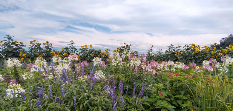 田んぼの稲の鮮やかな緑と、畑に植えられている可憐な花が、散歩しながら目の肥やしになります。近所には、花好きな農家の方が、野菜と一緒に花を植えている畑がところどころにあり、楽しませてもらえます。
