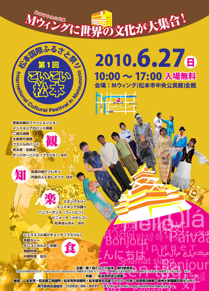 6/27(日)に開かれる第1回こいこい松本(松本国際ふるさと祭り)というイベントの案内をもらいました。