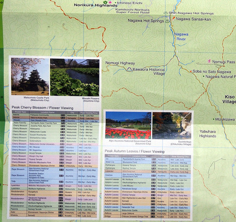 アジアの方は桜などの花や紅葉を見たい人も多いので、見られるスポットと地図中の位置・時期も表形式で記載しています。英語のガイドのリストも掲載。